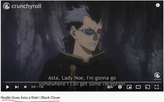Por ejemplo, este video de Black clover está acompañado con el título de «noelle gives asta a ride» (Noelle da un paseo con Asta).