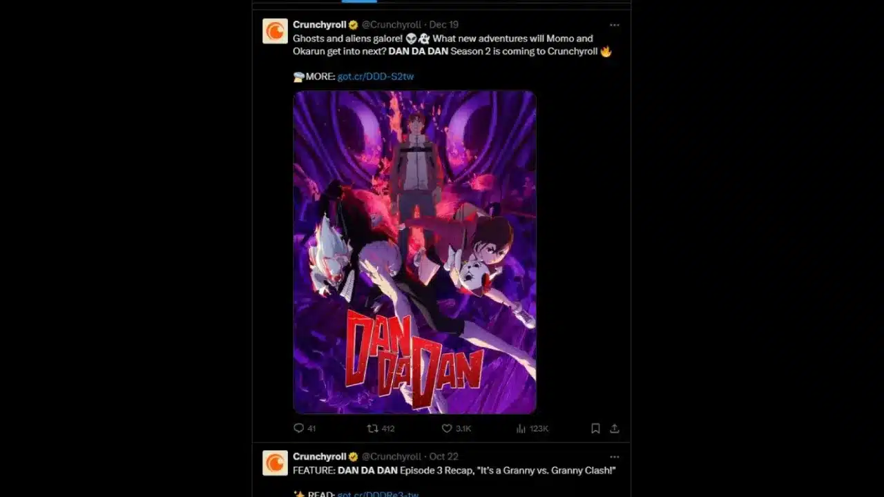 La última mención de DanDadan en la cuenta oficial de Crunchyroll en X (anteriormente Twitter) fue el 22 de octubre, y el silencio se extendió hasta el 21 de diciembre, cuando se anunció la segunda temporada del anime.