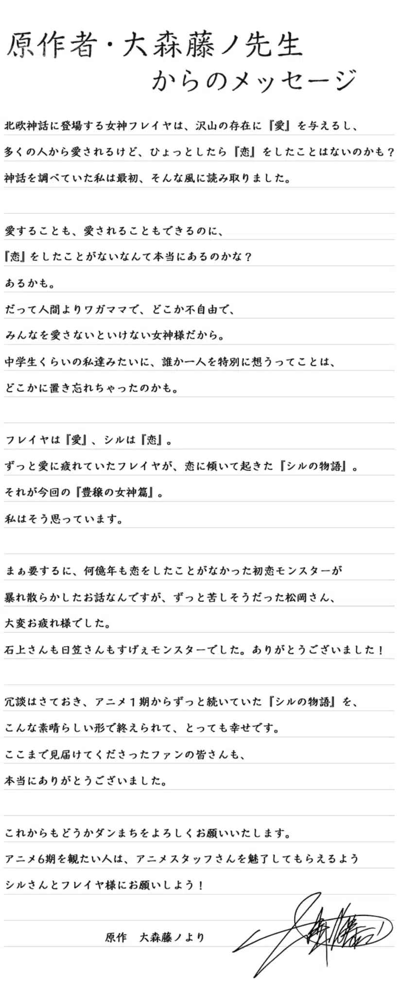En su mensaje, Omori reflexionó sobre el arco de la Diosa de la Cosecha, centrado en Freya y Syr, y cómo estas dos figuras representan el amor y el romance, respectivamente: «Freya, agotada por el amor, finalmente se inclinó hacia el romance, lo que dio lugar a la historia de Syr», explicó el autor. También agradeció a los Seiyuus, especialmente a Yoshitsugu Matsuoka (voz de Bell), por su dedicación y esfuerzo en la quinta temporada, omori destacó el trabajo de Shizuka Ishigami (voz de Syr) y Yoko Hikasa (voz de Freya), a quienes llamó monstruos absolutos por su desempeño en la serie.