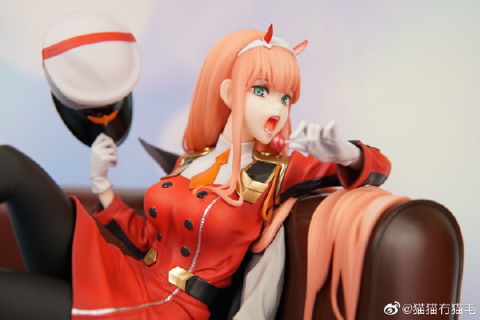 La figura nos muestra a Zero Two sentada en un sofá, mientras que sostienen con una mano una paleta y con otra mano su gorra, y destaca por tener texturas de gran calidad que recrean fielmente al personaje y resaltar pequeños detalles como las arrugas de la ropa.