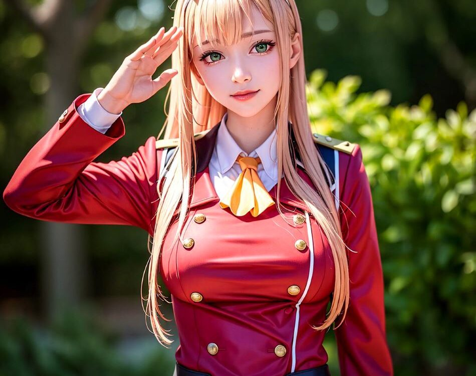 En esta encantadora ilustración, ambientada de día y presentada en una resolución que la hacen parecer real, como si se tratase de una fotografía, podemos apreciar en primer plano la figura de Zero Two de Darling in the Franxx, retratada en una pose seria, de la cintura para arriba, vestida con su icónico traje rojo con cinturón negro, botones dorados, camisa blanca debajo y mini corbata amarilla, haciendo una señal que se presta para varias interpretaciones. Una de ellas puede ser que esté dando una señal de saludo con su mano derecha mientras tiene inmóvil su brazo izquierdo.