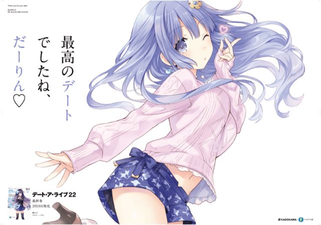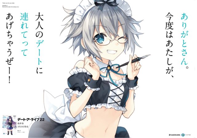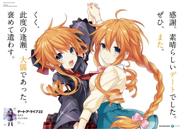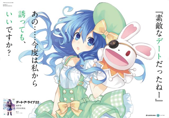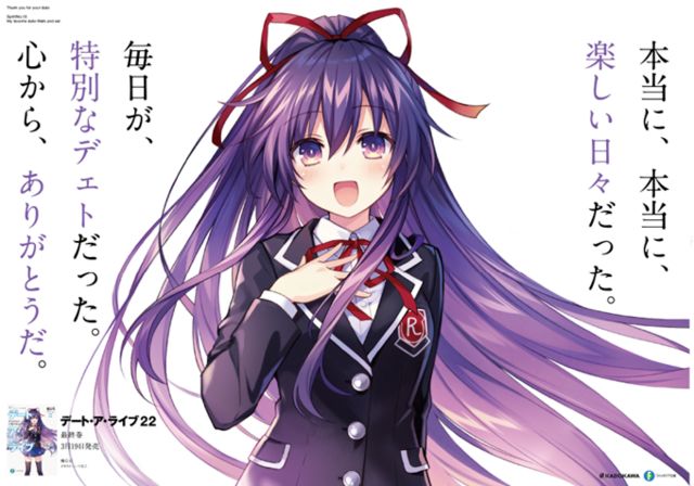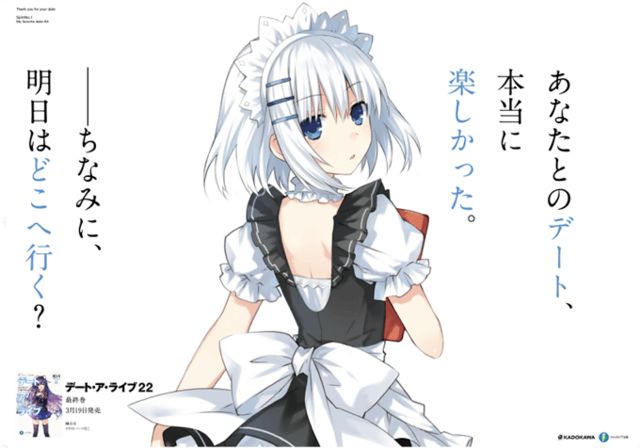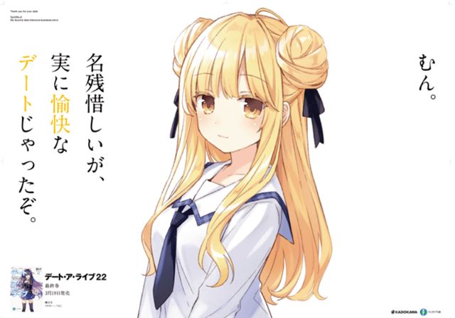 Para conmemorar el lanzamiento de la novela ligera «Tohka Good End Second Half», el último volumen 22 de la novela ligera Date A Live que saldrá a la venta el 19 de marzo, se exhibirán 10 ilustraciones de las protagonistas en la estación JR Machida a partir del 16 de marzo, solo durante una semana.