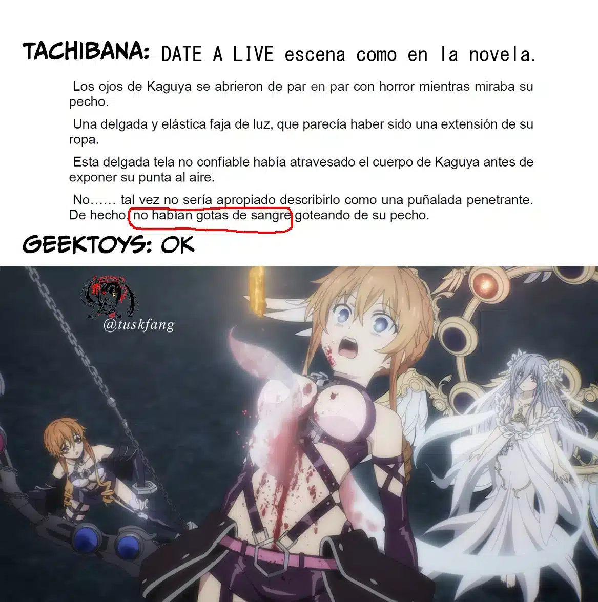 โNoโฆ tal vez no serรญa apropiado describirlo como una puรฑalada penetrante. De hecho no habรญa gotas de sangre goteando desde su tรณraxโ, con esta frase que se encuentra en la novela original de Date a Live, los fanรกticos descubrieron la gran diferencia entre esta y lo visto en el anime. Y es que en el รบltimo capรญtulo podemos ver como Kaguya no solo estรก recibiendo el mismo ataque que habrรญa terminado con su vida, sino que mucho lรญquido rojo sale expulsado desde esa zona, mostrando el cambio notable que se dio entre los dos medios.