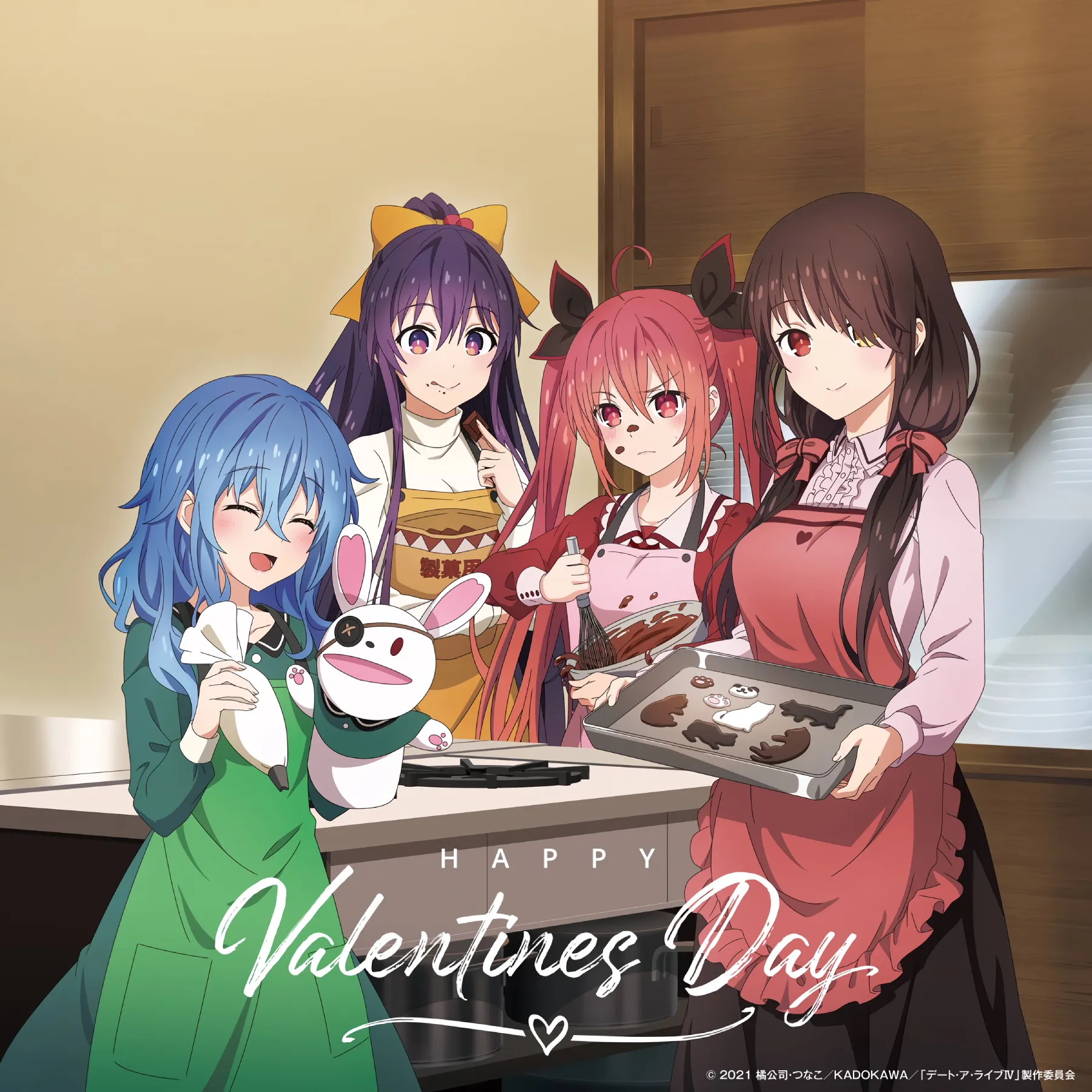 Con un lema que dice «Feliz Día de San Valentín«, en la visual podremos ver como las waifus Tohka, Kurumi, Kotori y Yoshino se encuentran preparando unos apetitosos chocolates para este día tan especial para los enamorados y las parejas. Además, se puede apreciar como cada cumplió una función en específico, siendo Kotori la encargada de preparar la mezcla del chocolate, Yoshino de decorarlos, Kurumi de sacarlas del horno y Tohka… se encargó de la degustación de los chocolates.