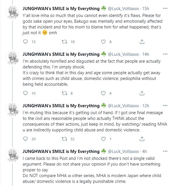 En las últimas horas ha circulado una controversia en Twitter que tiene como protagonista al popular anime Boku no Hero Academia (My Hero Academia) debido a que usuarios en la plataforma han acusado a la franquicia de normalizar el abuso infantil y la violencia doméstica. La situación surgió a raíz de una publicación realizada por el usuario @Luck_Voltiaxxx, en la que acusa a la serie de promover la violencia.
