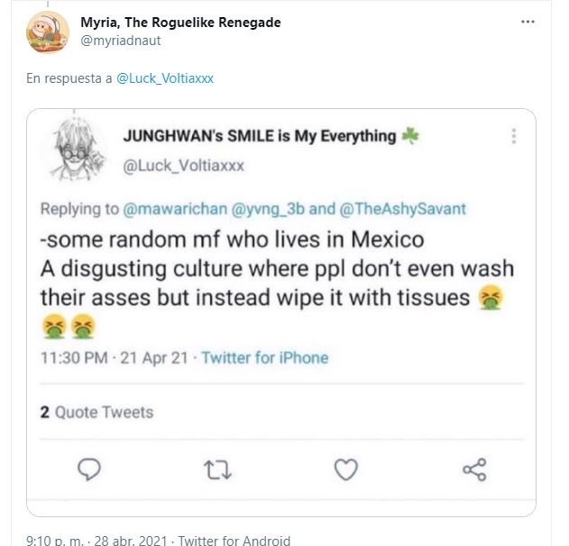 «Que ganas de joder con todo, agradezco que no sea el mismo tweet semanal de los cuerpos del manga pero._.) quejarse de BNHA por eso cuando en BC literalmente hay un adolescente que acosa y no para de imaginar cosas con su hermana que es menor de edad.-.»