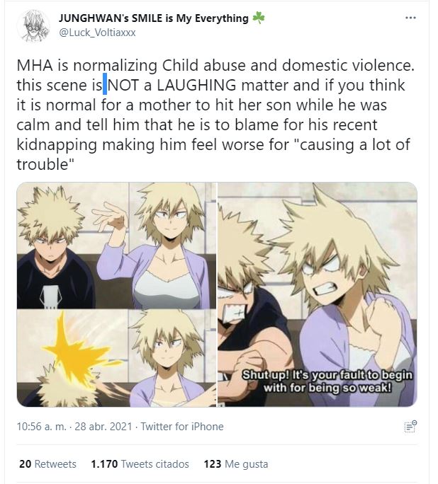 MHA está normalizando el abuso infantil y la violencia doméstica. Esta escena NO es un asunto de RISA y si crees que es normal que una madre golpee a su hijo mientras él estaba tranquilo y le diga que él es el culpable de su reciente secuestro haciéndolo sentir peor por «causarle muchos problemas»