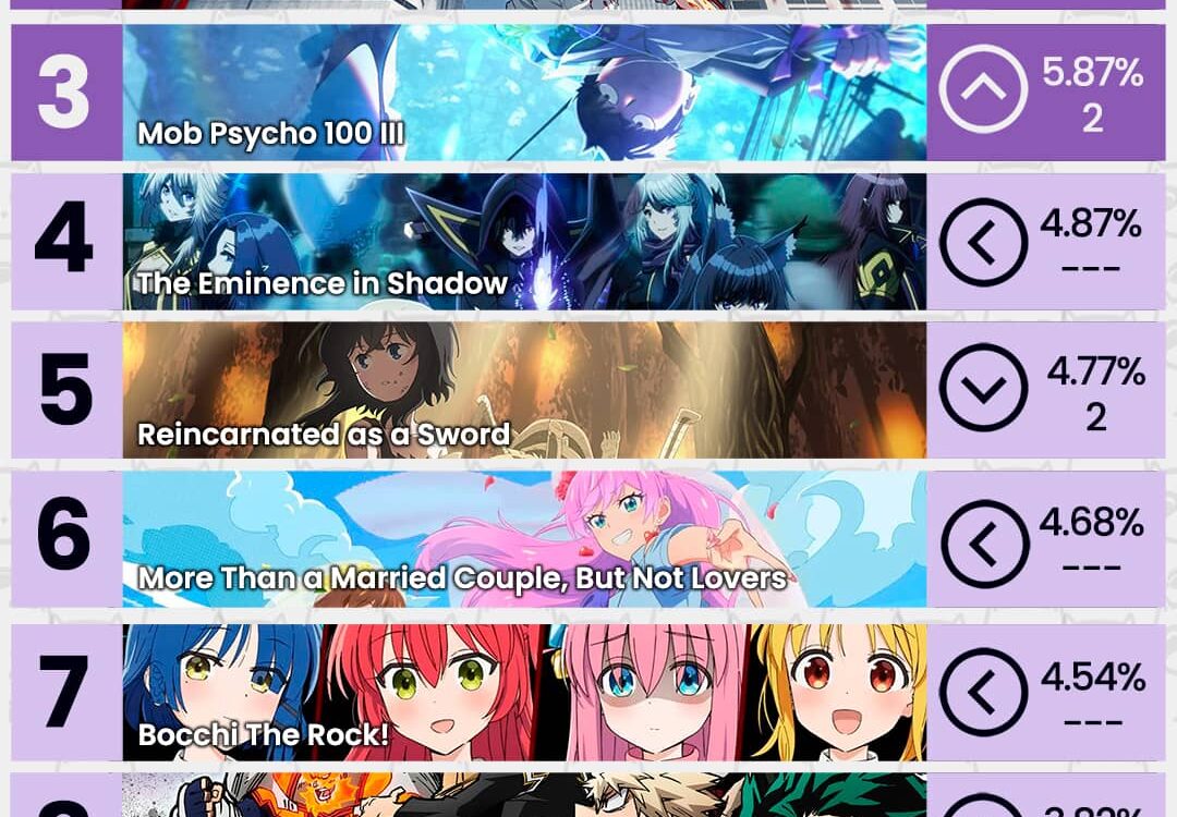 A destacar el re-ingreso al top de Akiba Maid War. Además, Golden Kamuy 4ta temporada, será retirado de las opciones de votación por el retraso en su emisión.
