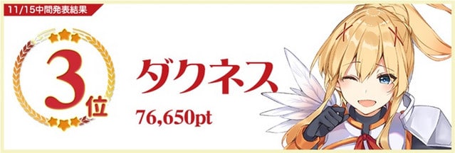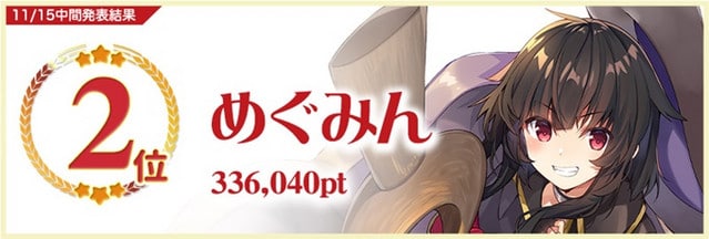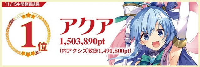 Como se esperaba, Aqua domina la clasificación actual con los abrumadores 1.503.890 puntos que es 4,5 veces más que los 336.040 puntos que logró conseguir Megumin, la protagonistas que se encuentra en segundo lugar.