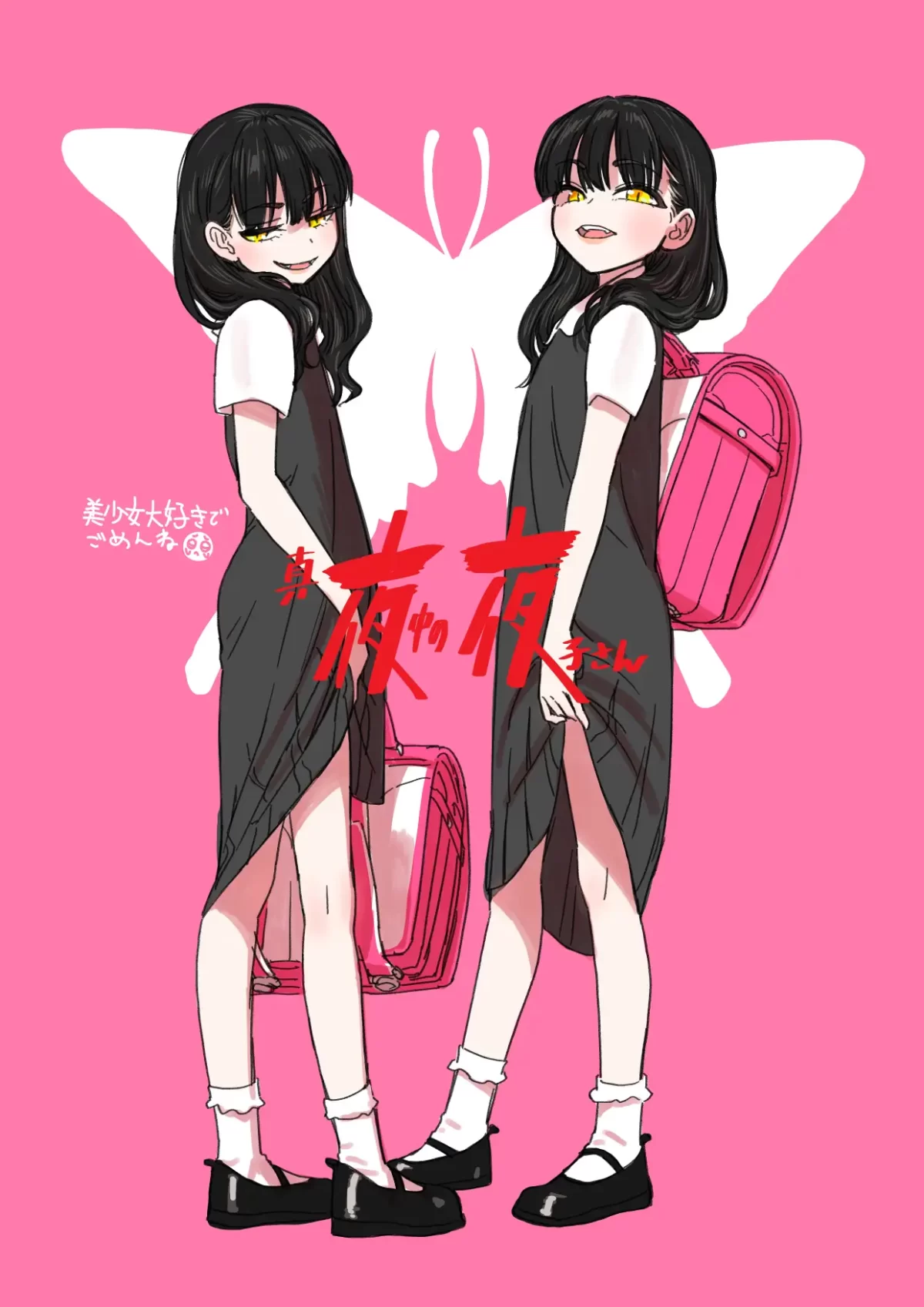 La imagen deja ver a dos adolescentes, podríamos decir que se trata de unas gemelas. Ambas llevan uniforme, el cual cuenta de una bata gris, que está colocada sobre una blusa blanca, sus calcetas blancas y sus zapatos negros son como los que llevan las niñas de primaria, esto da un aire más infantil a las chicas, podemos observar sus mochilas de color rosa, las cuales combinan con el fondo. Lo interesante aquí son las expresiones en el rostro de las chicas, se miran con una actitud traviesa y arrogante.