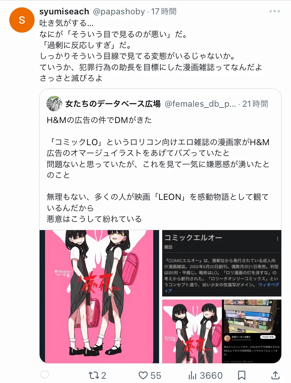 El usuario de Twitter @females_db_park nos compartió un post donde nos informa sobre la publicidad realizada para la marca H&M mostrada en las páginas de Comic LO, al parecer dicha ilustración para nada fue bien recibida, llovieron infinidad de críticas para la revista así como una oleada de mensajes violentos que se hicieron presentes en los foros de internet.