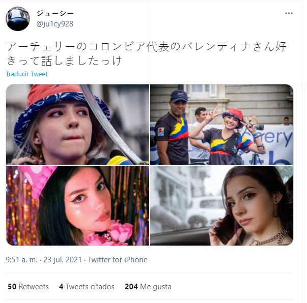 Resulta que en la disciplina de tiro al arco, Valentina Acosta Giraldo enamoró a la comunidad japonesa por su belleza y gran habilidad. Un usuario japones comento lo siguiente en Twitter: «Escuché que una arquera colombiana está disparando el corazón de los hombres».