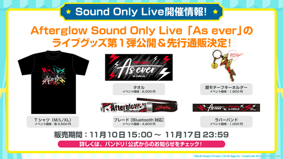 A trvés de su sitio web, la franquicia multimedia BanG Dream! anunció que el próximo concierto de la franquicia será transmitido de forma gratuita en su canal oficial de YouTube. El concierto, titulado Afterglow Sound Only Live: As ever, será el primer concierto de todos los que tienen planeado producir. Será transmitido los días 19 y 20 de diciembre, contando con dos transmisiones por día.