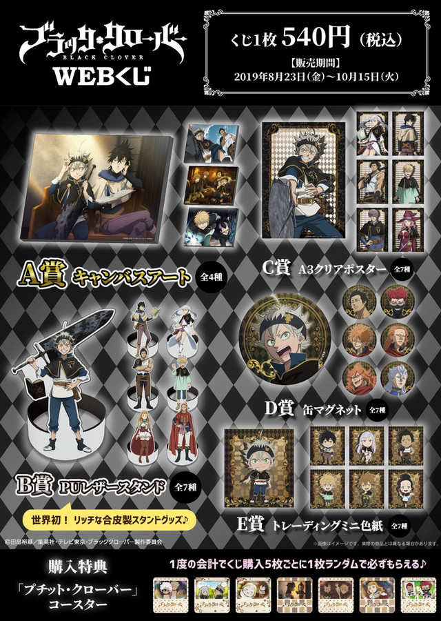 Del 23 de agosto al 15 de septiembre, los fanáticos de Black Clover en Japón pueden probar suerte con una lotería web que tiene algunos premios únicos. Cada intento le costará 540 yenes y se permiten hasta 10 intentos por persona.