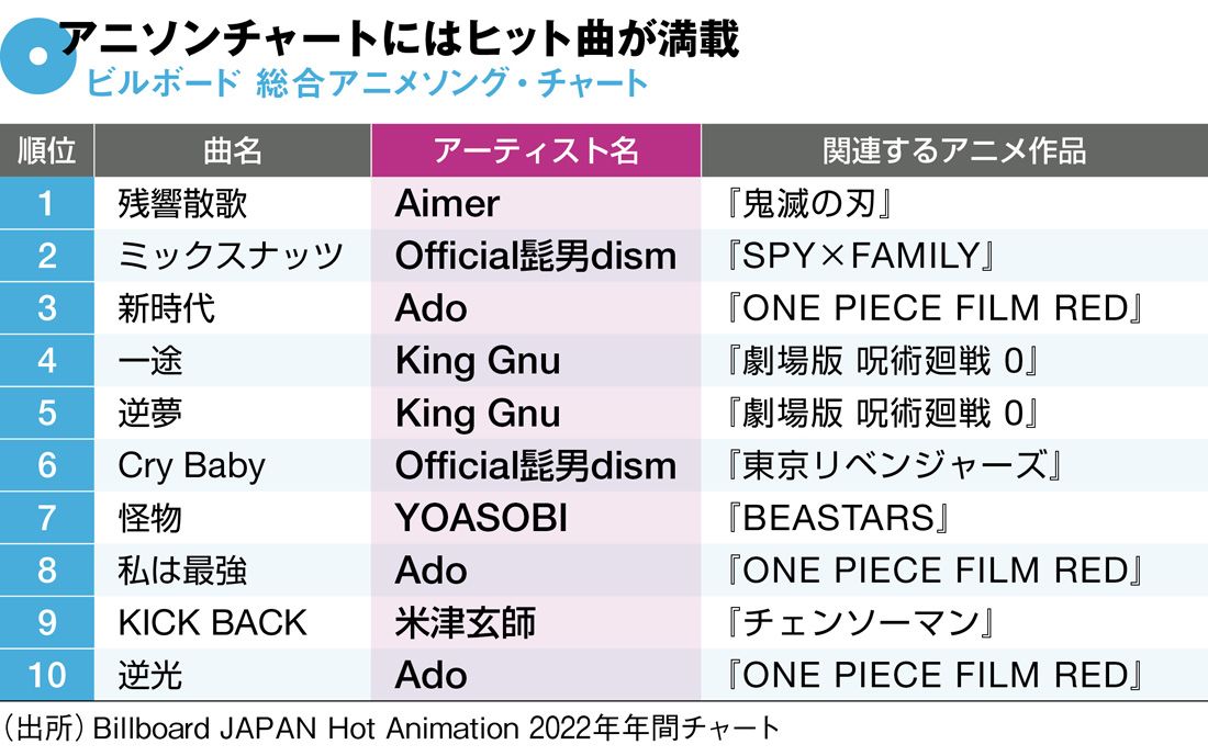 Después de tanto tiempo desde que se utilizaron los openings, el fenómeno parece no tener un fin aún, ya que en la actualidad el tema musical «KICK BACK» (Kenshi Yonezu) de Chainsaw Man dominó la lista de canciones relacionadas con el anime durante 26 semanas seguidas, que llega a ser un récord muy impresionante. Y en la actualidad, el tema musical «Idol» (YOASOBI) de Oshi no Ko, ha encabezado la lista en las últimas semanas y no parece que su popularidad llegue a acabar muy rápido.