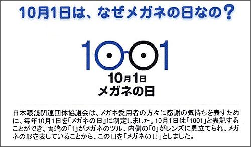 El origen de esta fecha es que el 1 de octubre se puede escribir como «1001», con el «1» en ambos extremos representando el armazón y el «0» en el interior representando la lente.