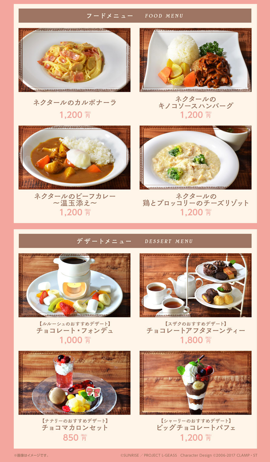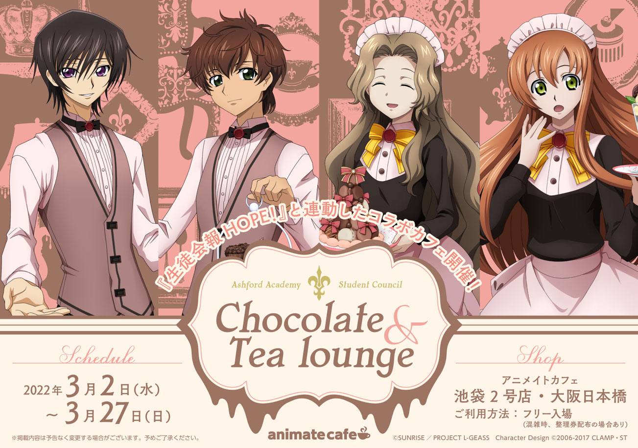 En el sitio web oficial de la cafetería Animate Cafe se anunció al público el comienzo de una colaboración con la franquicia Code Geass que consistirá en la producción de diferentes platillos y productos temáticos inspirados en los personajes Lelouch, Suzaku, Shirley y Nunnally. De manera adicional, se compartió una imagen promocional para la colaboración.