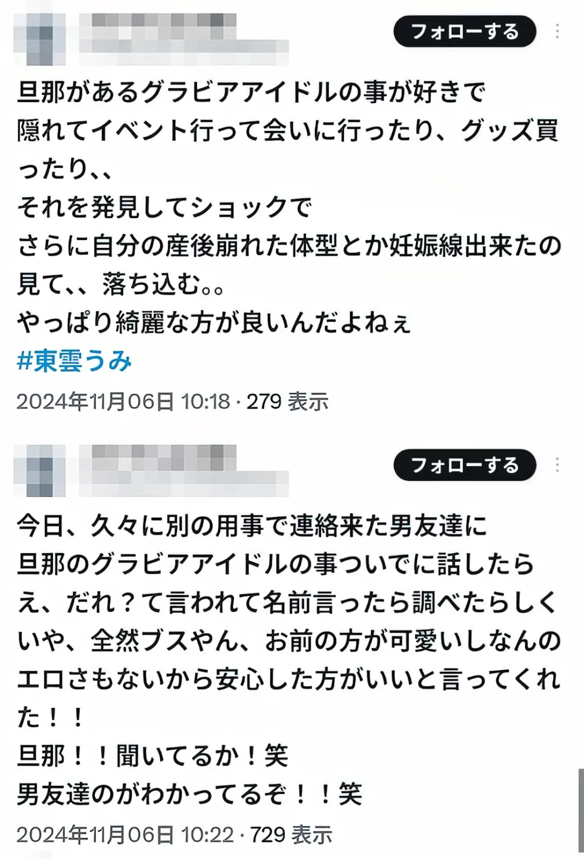 Resulta que se hicieron virales unos peculiares comentarios en la red social X/Twitter, los cuales provenían de la cuenta secreta de una mujer casada, en la cual se expresaba el enojo y la frustración que tenía la mujer hacia Umi, todo porque su esposo se había convertido en un ferviente fanático suyo. La mujer casada en algún punto de su vida descubrió que su esposo acudía a eventos en secreto sobre Umi Shinonome, incluso compraba sus productos, por lo que se sintió devastada.