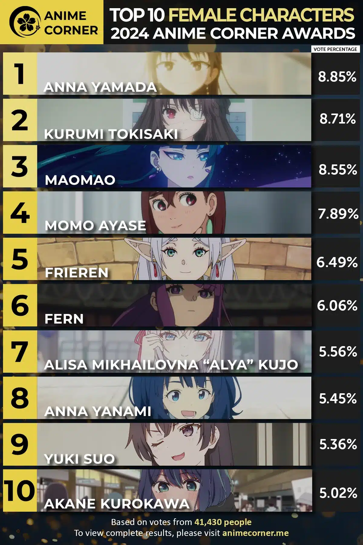 Este reconocimiento se llevรณ a cabo a travรฉs de una votaciรณn masiva donde participaron 41.430 personas. La competencia fue reรฑida, con personajes de renombre compitiendo por el codiciado tรญtulo. Anna Yamada se impuso a rivales fuertes como Kurumi Tokisaki de Date a Live V, quien quedรณ en segunda posiciรณn con una diferencia de apenas 0,14 % en los votos. Otras destacadas en la contienda fueron Maomao de The Apothecary Diaries, Momo de DAN DA DAN, y las queridas Fern y Frieren de Frieren: Beyond Journey’s End.