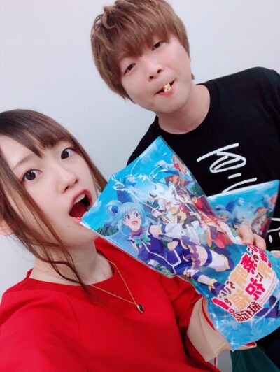 La seiyuu Rie Takahashi, voz de Megumin, compartió una foto en la que se le puede apreciar en compañia del seiyuu Jun Fukushima, voz de Kazuma. La imagen venía acompañada de una invitación para ver la pelicula, ademas que Rie comento que estaba comiendo palomitas explosivas.