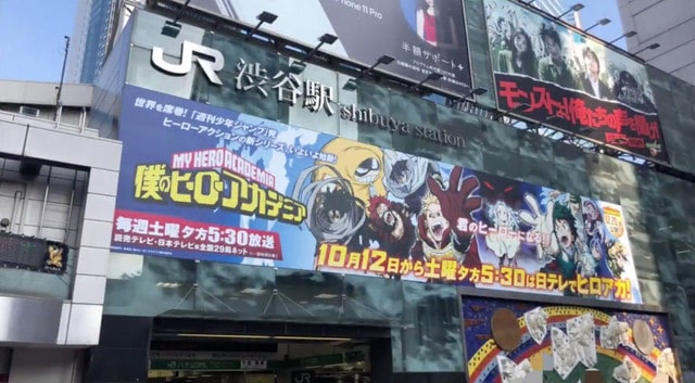10/12(土)の『僕のヒーローアカデミア』TVアニメ4期放送開始に向け、JR渋谷駅のハチ公広場前に巨大な4期キービジュアルが登場! ぜひ現地でご覧ください。