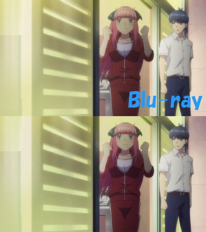 Tercer frame comparativo de la versión Blu-Ray y la versión emitida en televisión. A diferencia de las escenas previamente mostradas, Nino no tuvo ninguna corrección ni retoque en su animación.