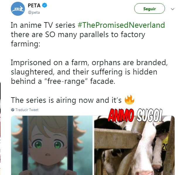 PETA comenta que Emma, Ray y Norman se dan cuenta de que están siendo criados para convertirse en alimento para los demonios, por lo que comienzan a idear un plan para escapar de la granja, algo muy similar a la vida real, donde según PETA los animales se escapan los mataderos y corren por calles concurridas, con la esperanza de salvar sus vidas.