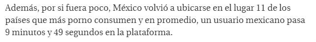 El titular se basa en las estadísticas de P*rnhb, correspondientes al año 2018, que se revelaron hace más de 5 meses y como dice el titulo, efectivamente el mexicano en promedio pasa 9 minutos con 49 segundos, pero durante una sesion en la plataforma P*rnhub.