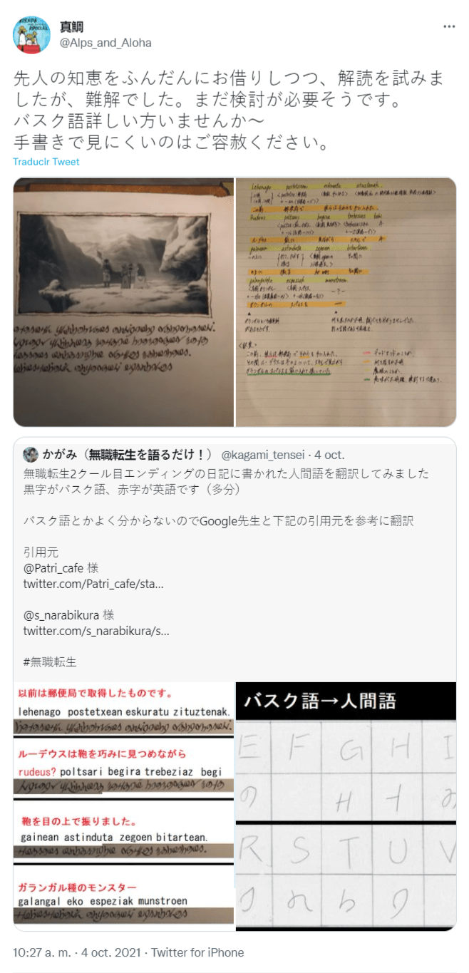 «Traté de descifrarlo tomando prestada la sabiduría de mis antepasados, pero fue difícil. Parece que todavía tenemos que considerarlo.«, «Intenté traducir el lenguaje humano escrito en el diario al final de la segunda temporada de Mushoku Tensei. Las letras negras son vascas, y las rojas son inglesas (quizás)«.