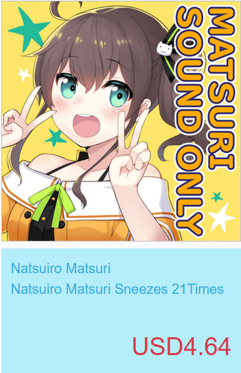 Por ejemplo, puedes escuchar a Natsuiro Matsuri estornudar 21 veces por tan solo 4.64 dólares. Ademas, través de un sitio web puedes comprar diferentes pack de audios de las VTubers, teniendo la oportunidad de comprar todo el conjunto de audios o solo un pack de audio en específico. Permitiendo a la comunidad tener la oportunidad de pagar 37 dólares por escuchar a un VTuber alcoholizada lamer orejas en un ASMR.