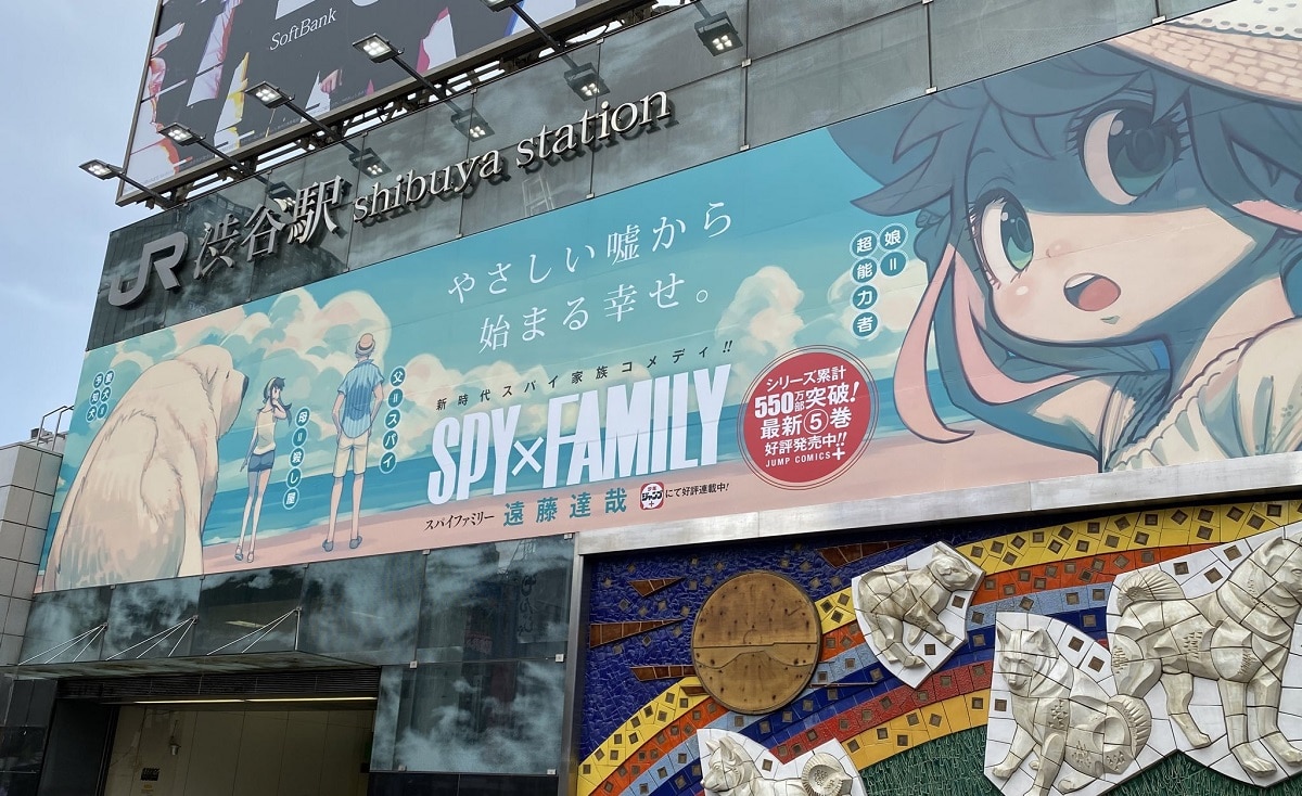 En la estación de Shibuya se colocó un gigantesco anuncio sobre el manga SPY×FAMILY, escrito e ilustrado por Tatsuya Endou, para promocionar el reciente lanzamiento del volumen #5, y las excelentes ventas que ha logrado la obra (aproximadamente 5.5 millones de copias).
