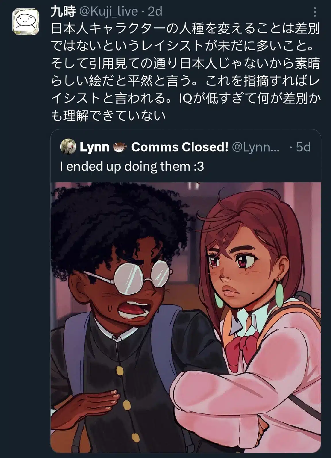 Este usuario llamado «@Kuji_live» cito esta publicación acusando a la ilustradora de ser «inapropiada» con el siguiente mensaje: «Todavía hay muchos racistas que dicen que cambiar la raza de un personaje japonés no es racista. Y como se puede ver en la cita, dicen rotundamente que es un gran dibujo porque no es japonés. Ha que señalar esto y llamarles racistas; tienen un coeficiente intelectual tan bajo que ni siquiera entienden lo que es el racismo».