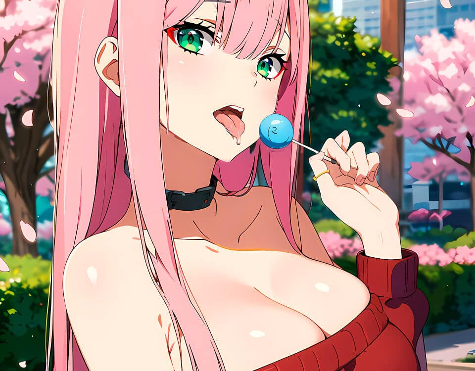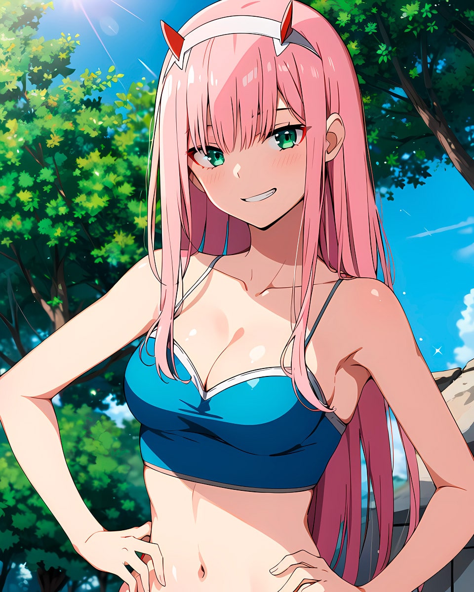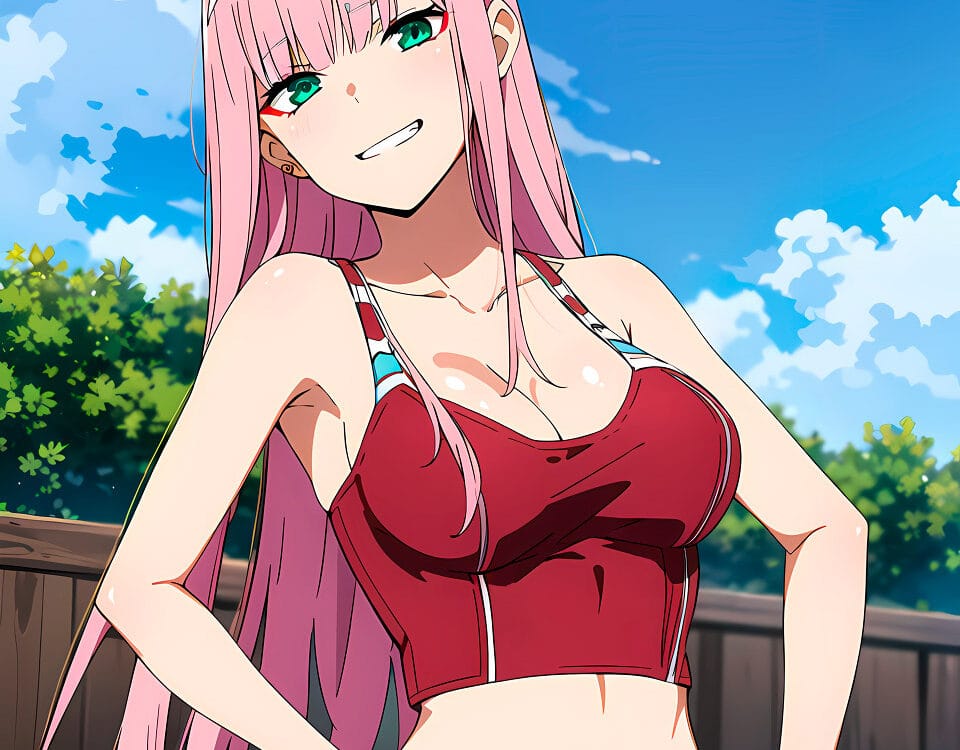 En las ilustraciones generadas por una inteligencia artificial, se muestra a la popular waifu Zero Two en diferentes situaciones. Gracias a esto, también podremos verla vestir diferentes atuendos, en el que se destaca su característico uniforme, ropa más «ligera», un atractivo traje de baño y más.