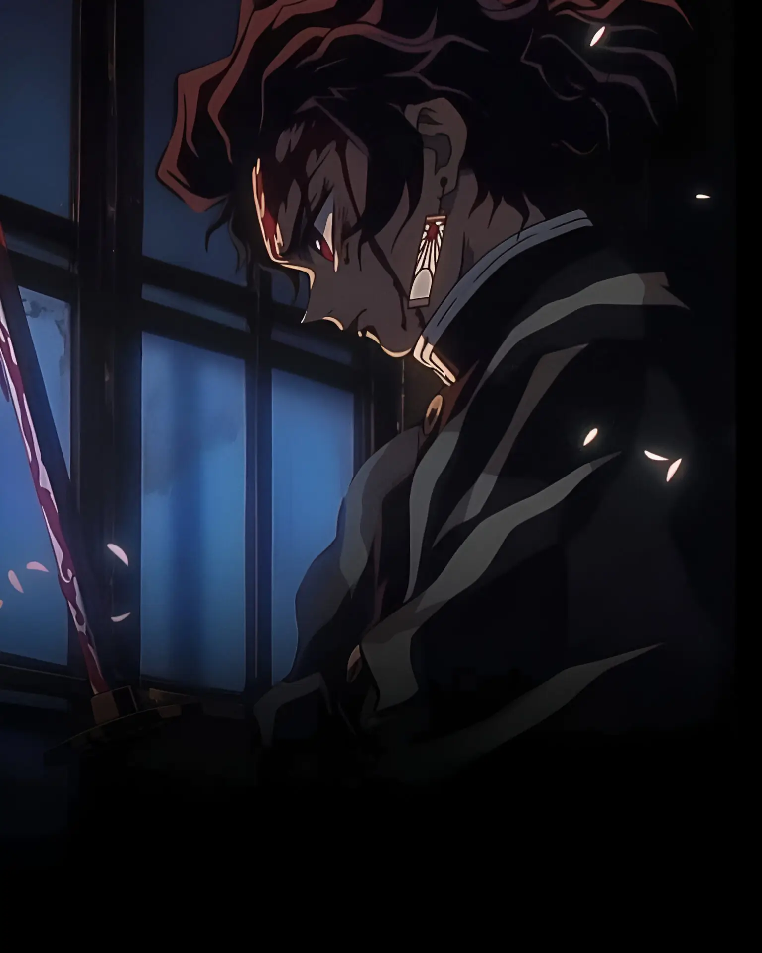 Mismo caso que con Tanjiro tenemos al inolvidable Rengoku cuya imagen hace contraste con la del joven Kamado, al pilar del fuego podemos verlo en un escenario exterior donde notamos las hojas de los árboles. Y como en esta ocasión la luz de la luna baña su espalda oscureciendo su rostro, podríamos decir que esto luce hasta melancólico dado el hecho de que ya conocemos el final de este personaje.