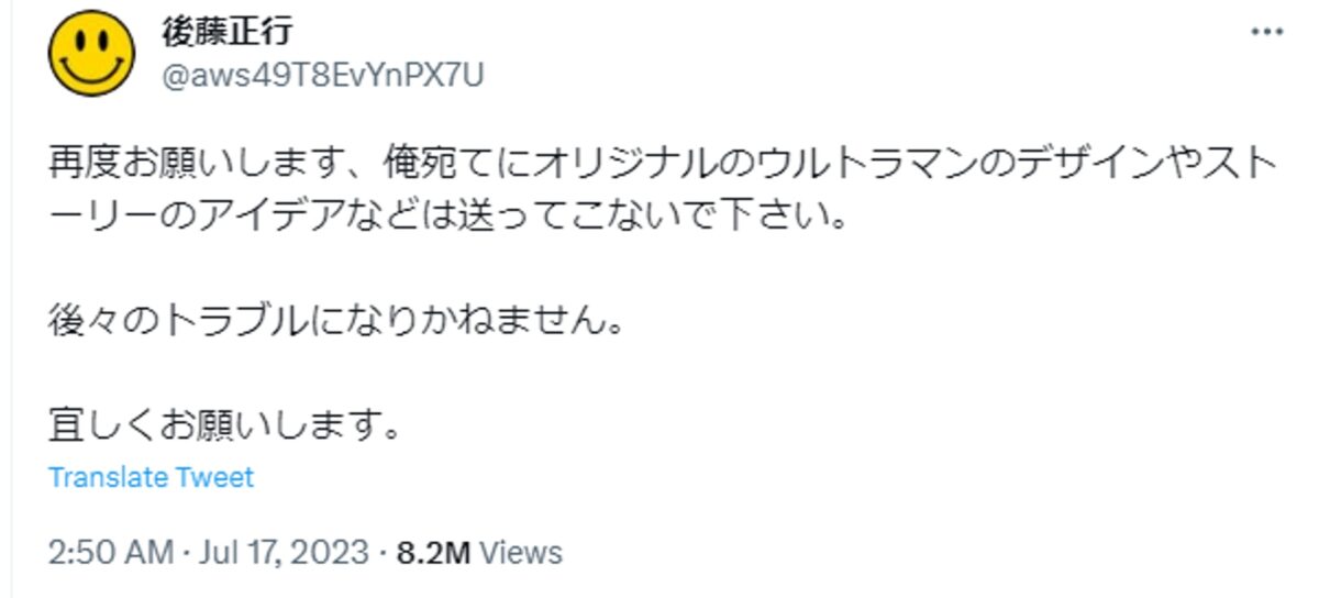 Con una trayectoria que incluye su participación desde Ultraman Ginga, destacó que si bien es agradable que los fanáticos disfruten de la serie y desarrollen sus propias ideas o diseños originales de Ultraman para su disfrute personal, lo que advierte es el acto de enviar esas ideas directamente a la compañía.