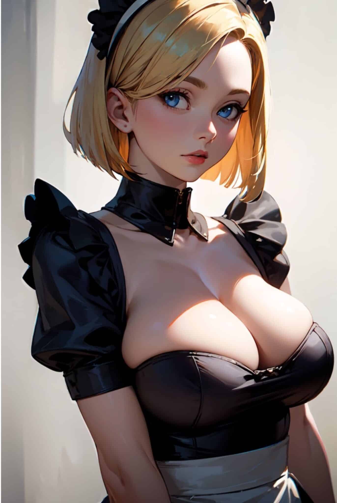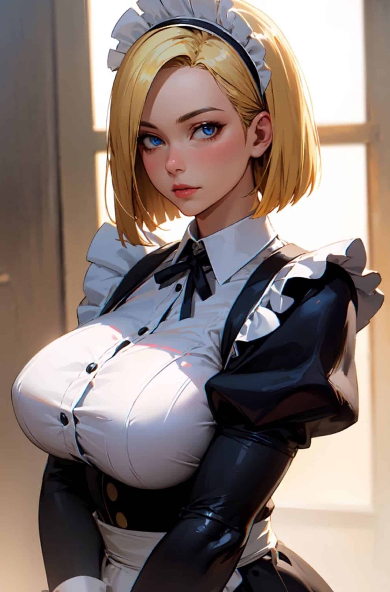 Si bien cada una de las imágenes nos muestra al personaje con un atuendo diferente de mucama, el trabajo de la Inteligencia Artificial es presentar a la Androide 18 de una manera irresistible para la vista del público, en donde sus encantos femeninos y sus atributos han sido aumentados de una manera sorprendente.