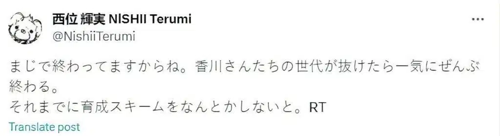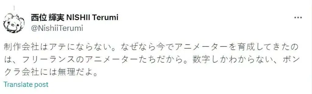 «No se puede confiar en los estudios de producción porque quienes crearon a los animadores ahora son animadores independientes. Es imposible que existan empresas sin conocimientos que sólo entiendan de números”. En 2 tuits, la animadora expresó su profunda preocupación sobre la actualidad del anime, refiriéndose a que los estudios en el afán de crear más ganancias están descuidando algo fundamental en la industria y eso es la formación de nuevos talentos que suplan los que están de salida. Esto evidente viene a agravar una situación que ya es muy precaria para los animadores.