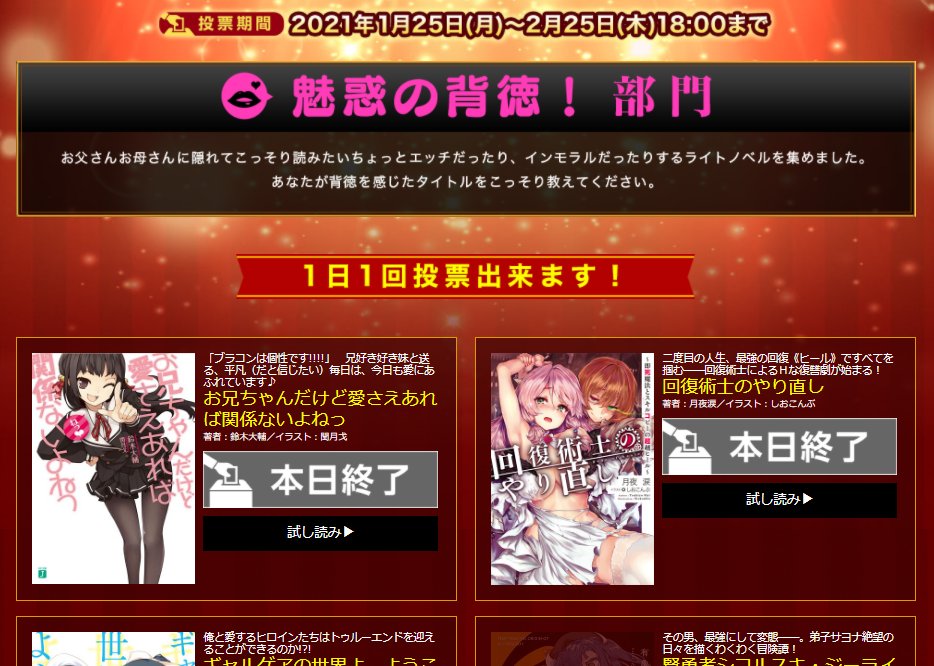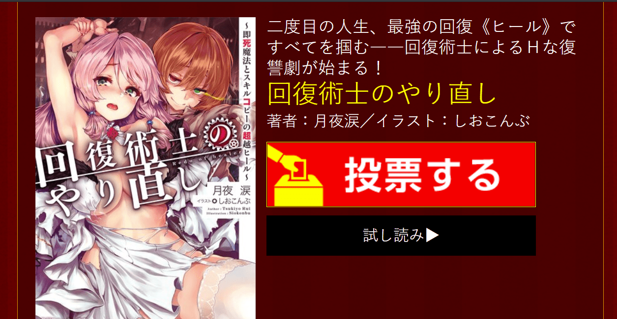 Redo de Healer (Kaifuku Jutsushi no Yarinaoshi) ha sido nominado para este concurso. Por favor, voten. ¡Cualquiera puede votar! ¡Apoyen por todos los medios a Redo of Healer!