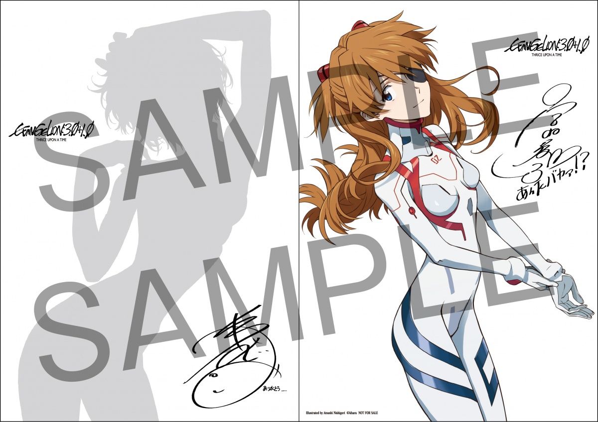 A través de su sitio web oficial del estudio de animación Khara, se anunció que los espectadores que asistan a las funciones del filme Evangelion: 3.0 + 1.0 Thrice Upon, estarán recibiendo un poster en tamaño A4 con los personajes Asuka y Rei. Este obsequio se empezara a entregar a partir del viernes 15 de mayo en Japón.
