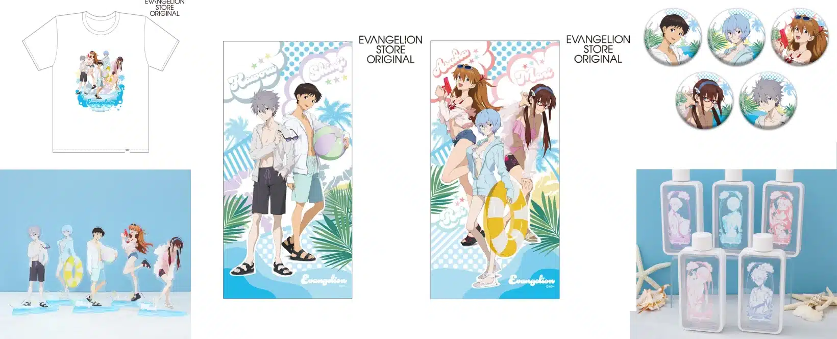 - Toallas de baño EVA STORE Originales – Disponibles en 2 combinaciones de personajes Shinji y Kaworu / Rei, Asuka y Mari por 4,950 yenes (32 USD) cada una.