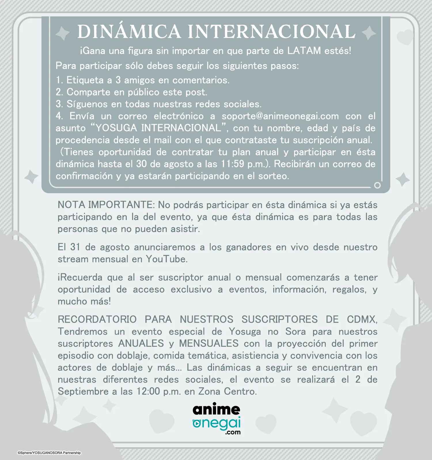 Esta dinámica está pensada para todos los suscriptores anuales de Anime Onegai que no puedan asistir al primer evento oficial de Yosuga no Sora en México, donde se proyectará el primer episodio del anime, habrá comida temática, convivencia con los actores de doblaje y mucho más. Si quieres saber más sobre este evento presencial, puedes consultar la publicación anterior publicada aquí en ANMO Sugoi.