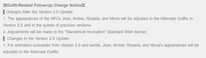 El cambio de atuendo en los personajes femeninos Jean, Amber, Rosaria y Mona serán los mismos que se usan en China y serán implementados en las cinemáticas a partir de la versión 2.6. Estos atuendos están disponibles desde el 27 de enero y ya no se podrán reclamar una vez finalice la versión 2.4.