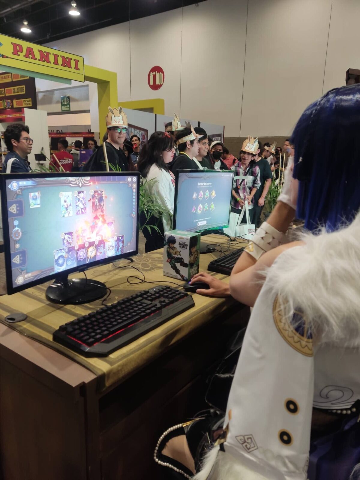 Por último, tuvimos un evento de 5 rondas de Genius Invokation donde los jugadores podían participar y mostrar sus mejores mazos y tácticas, siendo que en cada ronda completa participaban 4 jugadores. Pero claro, no estaban solos, a su lado tenían a nada menos que las propias cosplayers invitadas asesorándolos sobre el juego y diciéndoles las mejores tácticas para ganar.