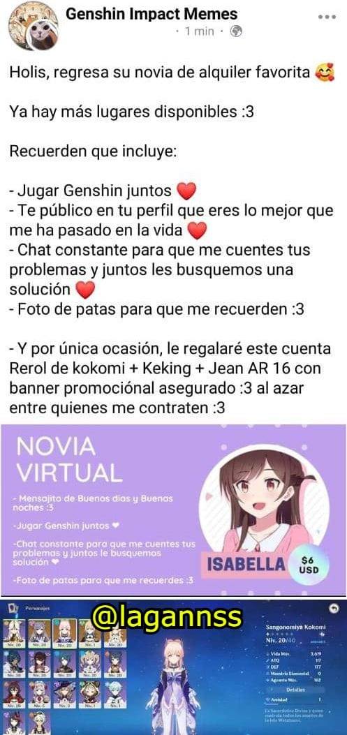 Si pensabas que alquilar una novia era una situación peculiar en Kanojo, Okarishimasu (Rent-a-Girlfriend), ahora tú puedes hacer lo mismo, o más o menos porque esta vez se trata de una novia virtual, servicio que se ha promocionado por algunas usuarias a través de grupos de Facebook, principalmente del videojuego Genshin Impact.