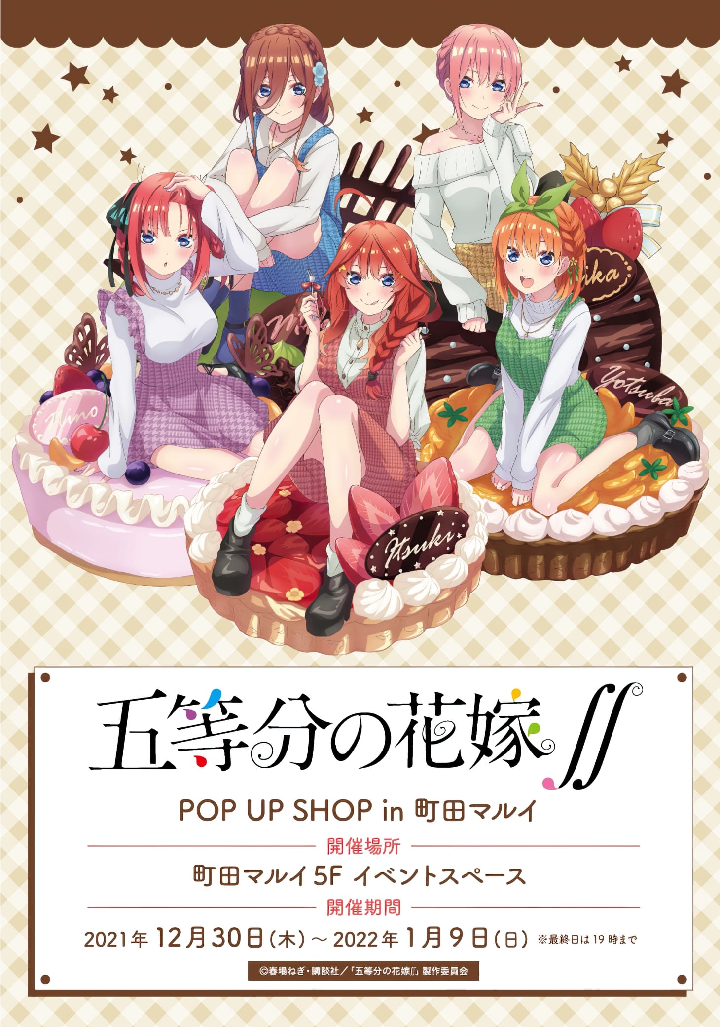 El evento con temática del anime Go-Toubun no Hanayome comenzará este 30 de diciembre hasta el próximo 9 de enero del año 2022, en el que se abrirá una tienda «POP UP SHOP» y se exhibirán algunos productos como un Tapiz B2, figuras de acrílico, llaveros de acrílico, insignias, camisetas/sudaderas/gorras, una riñonera, entre otras cosas.