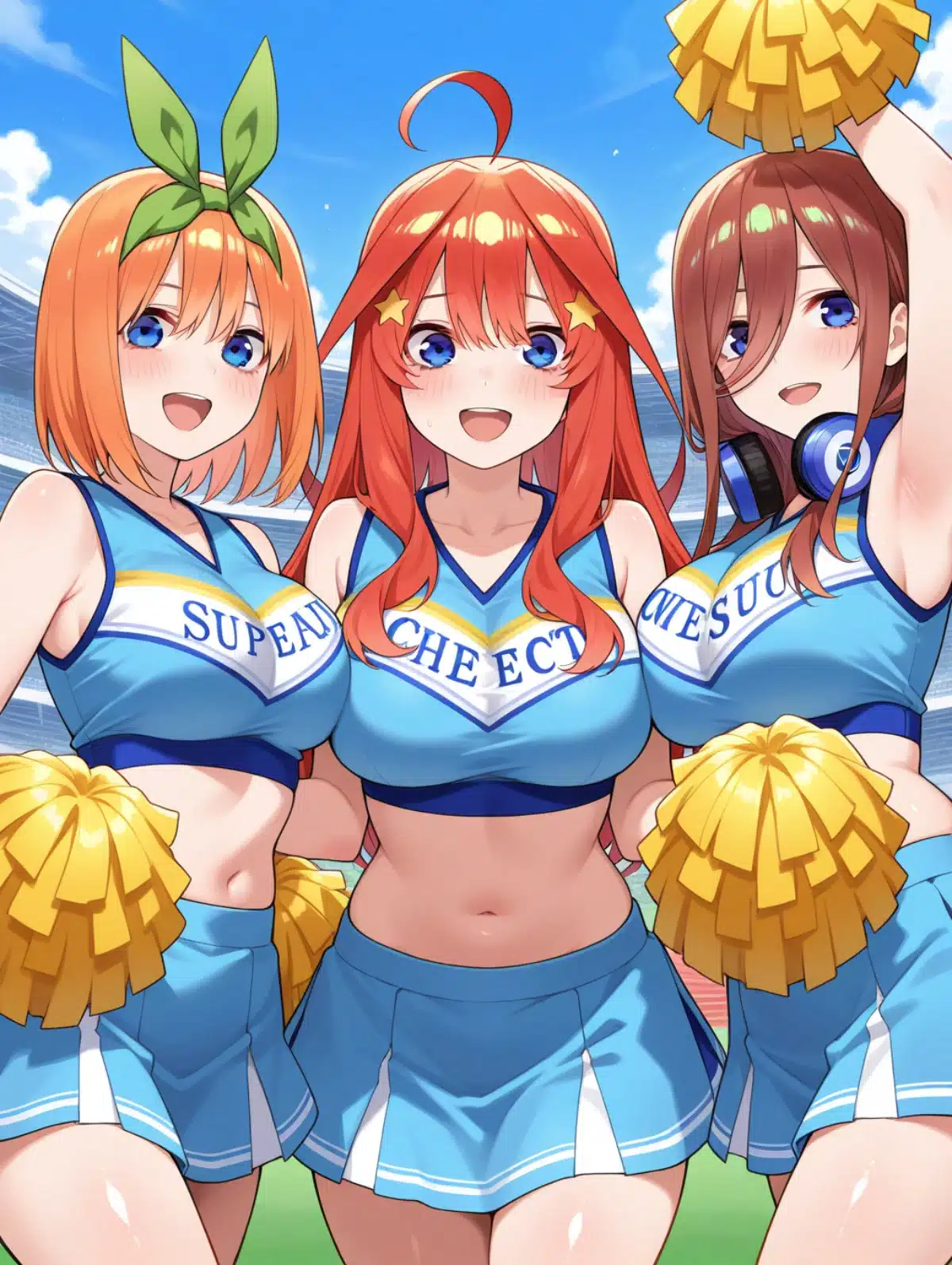 Para los fanáticos del anime Go-Toubun no Hanayome (The Quintessential Quintuplets) llega una nueva ilustración que los enamorará. Esto por el hecho de que las protagonistas son 3 de las 5 hermanas más queridas de la obra, como lo son Miku, Itsuki y Yotsuba. Pero es que además la ilustración logra destacarse del resto, ya que nos muestra a las chicas en un ambiente nunca antes visto. Ahora las hermanas se vestirán como unas lindas porristas, con sus atuendos correspondientes y donde más de uno disfrutará.