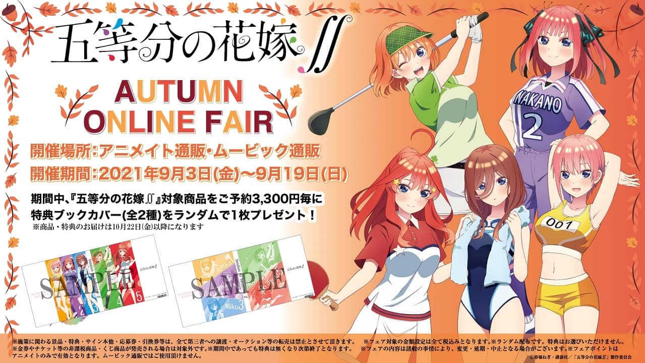 La colaboraciรณn comenzรณ el 3 de septiembre en Japรณn y finalizarรก hasta el 19 de septiembre. Teniendo la posibilidad de adquirir una amplia variedad de mercancรญa en la que se incluyen llaveros de acrilico, carpetas de plรกstico, ilustraciones en acrรญlico, figuras en acrilico, papel tapiz, toallas deportivas, insignias y bolsas.Go-Toubun no Hanayome: Las quintillizas lucen encantadores informes deportivos Go-Toubun no Hanayome: Las quintillizas lucen encantadores informes deportivos