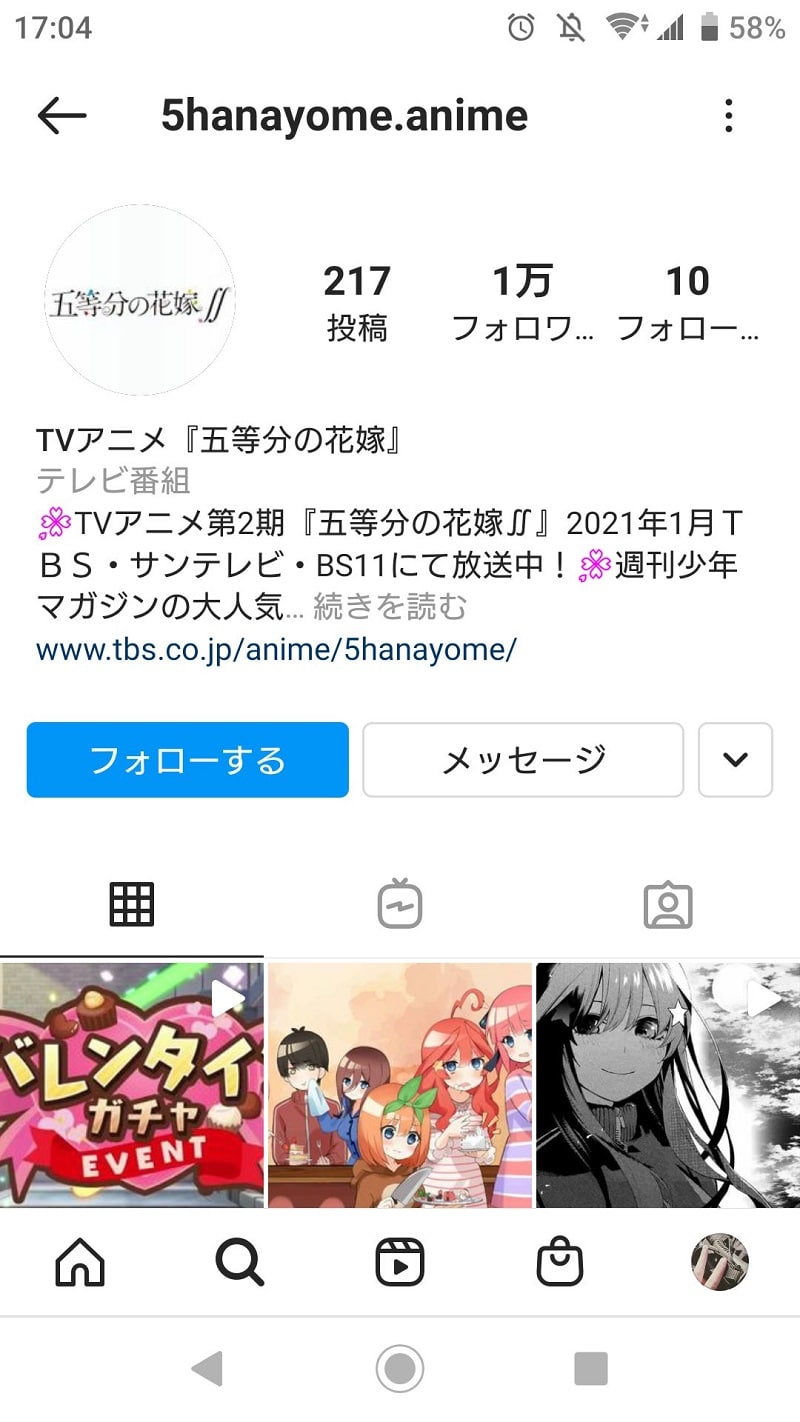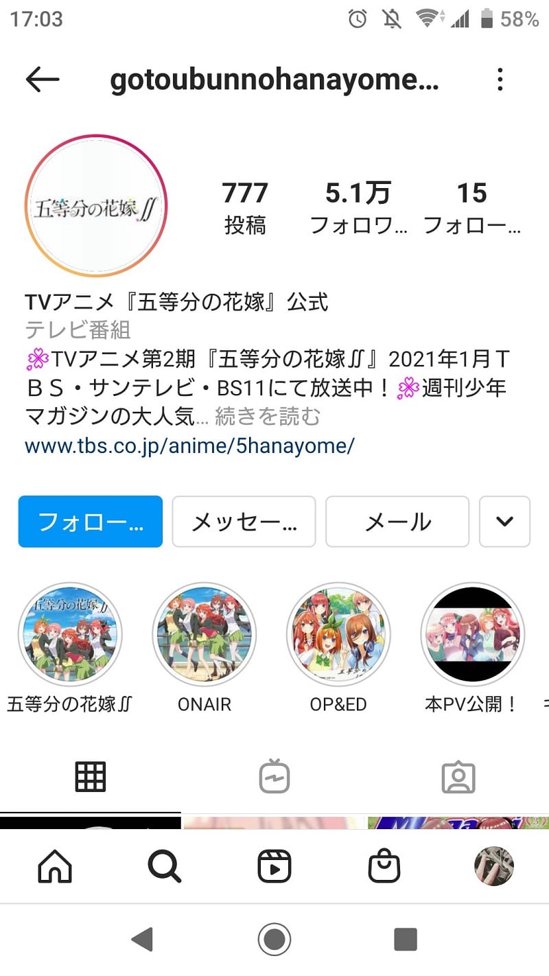 InstagramにてTVアニメ「#五等分の花嫁」公式を騙ったアカウントがございますが、現在Instagramの公式アカウントは存在しないため、ご注意いただきますようお願いいたします。またアニメ情報については、本アカウントもしくは公式HP(https://t.co/wMvgSuJA34)をご覧ください。
