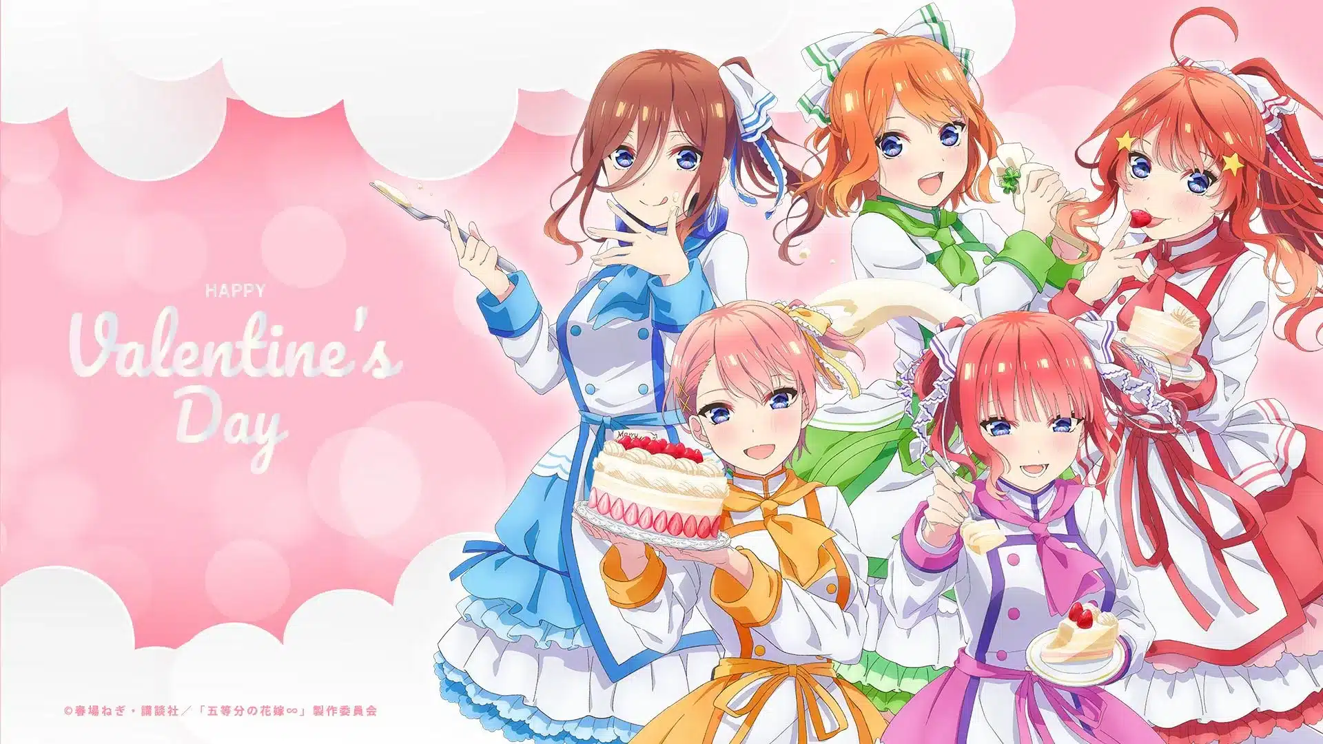 En esta encantadora visual de las quintillizas, acompañada con un mensaje de «Feliz San Valentín» en la publicación, podremos ver cómo les desean a los enamorados y parejas un feliz día. Además, vale la pena destacar que las hermanas Nakano han sido vestidas con un atuendo de reposteras y en la imagen se puede apreciar como han preparado un delicioso pastel para celebrar esta fecha especial junto a los fanáticos.
