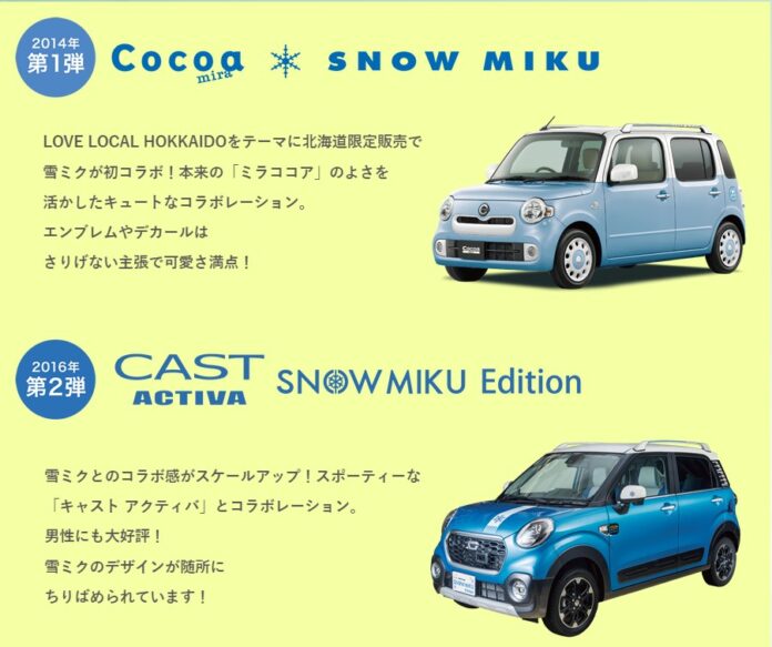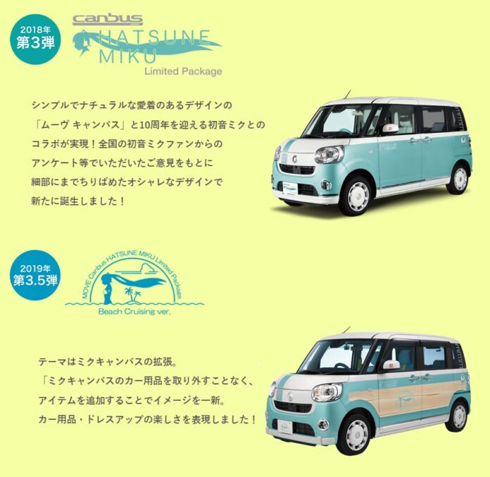 A través del sitio web oficial del fabricante de autos Daihatsu, se anunció la comercialización de accesorios (Itasha) para autos inspirado en Hatsune Miku, el Itasha (término usado en Japón para referirse a la decoración de automóviles con personajes de anime, manga o videojuegos) se encuentra disponible desde el 3 de diciembre a 174.460 yenes (alrededor de 1546.43 dólares americanos) y se lo podrá adquirir en la tienda oficial en Amazon Japan.